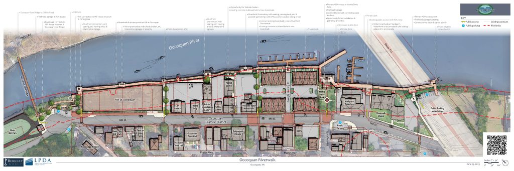 From September 2022 through November 2023, the Town of Occoquan worked with the Berkley Group and community stakeholders to create a vision plan for expanding the Town Dock and Riverwalk. The process involved multiple opportunities for community input and produced visioning documents, maps, and vignettes that will help the Town and potential partners visualize the future Riverwalk.